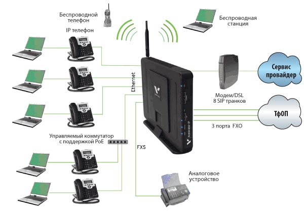 Раньше ещё производилась и поставлялась модель Xcelerator IP, которая использовалась для телефонизации маленьких офисов с численностью до 24 абонентов, но по состоянию 2014 года, если ещё и можно будет её купить, то это будут какие-то остатки ранее завезённых партий. Если у кого-то она имеется в наличии и используется, то мы готовы взять таких абонентов в техподдержку и обеспечить обслуживание IP-АТС. Это устройство оптимально подходило для телефонизации и обслуживания небольших офисов, т.к. было устройством «всё в одном» и обеспечивало максимальную эффективность. Вот, сами посмотрите на схему использования этого устройства